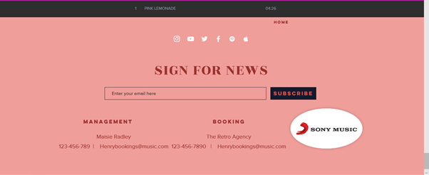 I intend to create a sense of ‘house style’ across the page with waves/sea imagery contrasted by pink text which is in relation to the song title. I intend to have a looped video of Henry playing guitar also as a banner background near the head of the music video, taking inspiration from Sony artists such as Tom Odell who also feature this.